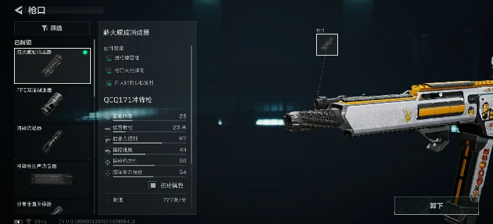 枪口选择薪火螺旋消焰器。这款枪口没有任何负面属性,能同时提升枪械的开火稳定性与据枪稳定性,是零代价强化的高性价比选择。
