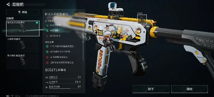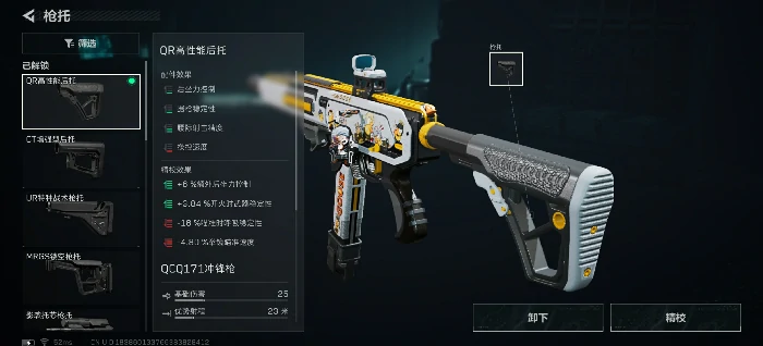 QCQ171本身在近距离有一定压制力,但和以腰射为核心优势的MP7相比还有差距,因此枪托选用QR高性能后托,大幅强化腰射准度,补足近战压制的短板,让枪械在贴脸交锋时也能有一战之力。