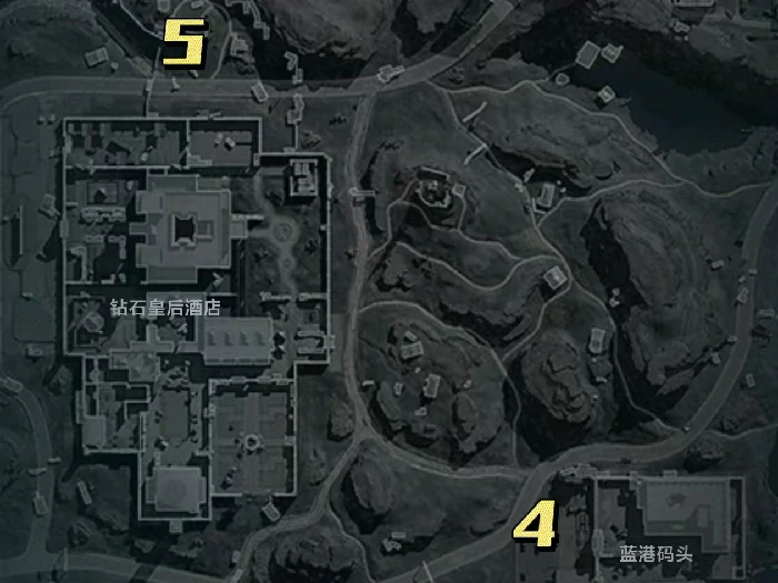 5号空投降落点位在钻石皇后酒店地图正上方的高小山丘上。
