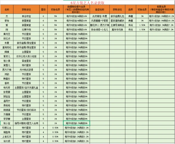 助理培养:前期不用在助理身上投入太多合同,优先把资源放在技能升级上。等技能升到一个比较均衡的阶段后,再开始提升助理等级。提升时优先选能增加古装名录的助理,比如紫怡、爱、朱霞这类对古装名录有加成的助理