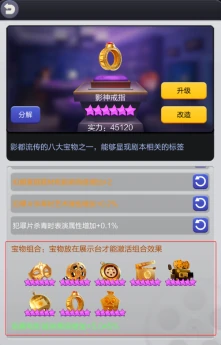 宝物系统:会所15层可以解锁三款中国宝物,把这三款宝物放在展台上,能提升中国艺人出演电影的首映票房;另外,合成八大宝物并放在展台上,也能获得固定的首映票房加成。合成需要用5星宝物加钻石,这部分比较看运气,欧皇几万钻石就能搞定,而且宝物的词条还能改造强化