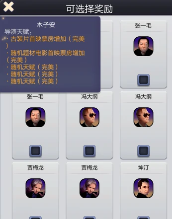 自选宝箱可以选择带剧本类型首映词条的导演,换出来的导演必定自带两条首映票房加成,其他加成随机,同样建议根据自己常玩的剧本类型来选对应加成的导演。