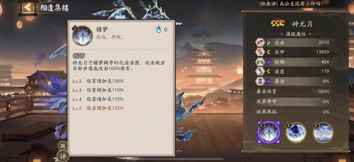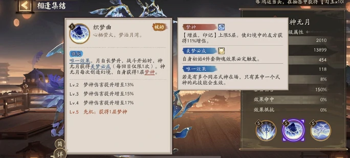 此效果唯一。月从长梦中升起,战斗开启时,神无月自动获得美梦必成效果,每个回目仅能触发1次。每当神无月创造出幻境,就能为自身叠加1层梦神印记。