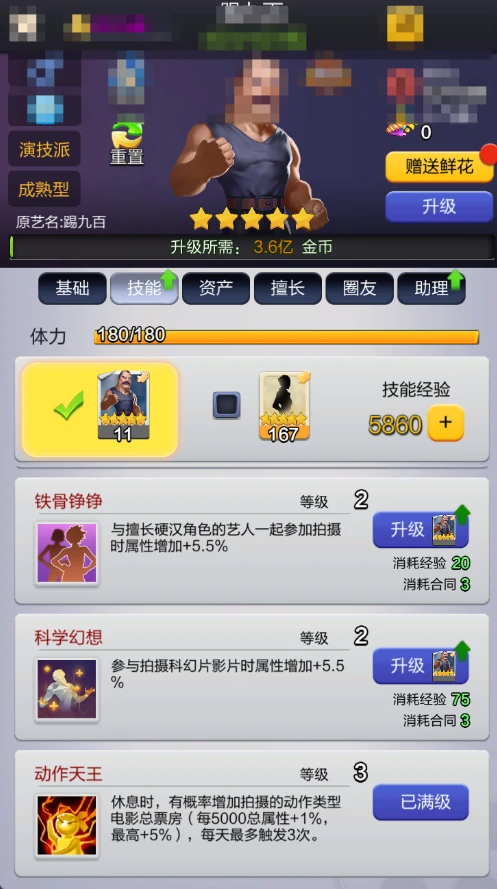 艺人自带的擅长词条+剧本词条,是提升票房的核心玩法之一。玩家可以通过积攒擅长卡进行针对性训练,不同品质词条的加成幅度不同:蓝色词条有概率加3%首映票房<金色词条有概率加5%首映票房<紫色词条有概率加10%首映票房。训练时可以优先选择常用热门词条,也能用钻石锁定词条,但前期不建议在这里投入钻石,等词条升级到金色后,再用钻石针对性训练更划算。另外,针对性训练的折扣和会所等级挂钩,图片仅作参考