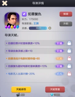 导演获取途径:21天后开启的大循环活动中可以获取,日常招募也能出,但日常招募最高只能拿到4星导演,大家可以根据自身需求选择。星级越高的导演,票房上限也越高。花几万钻石能拿到第一轮自选导演,建议优先选古装导演,然后看词条:优先选带犯罪+警匪词条的,其次是犯罪+复仇词条的。刷新词条要注意顺序,一定要先把警匪词条洗出来再锁住,接着洗犯罪词条。因为剧本词条种类多,随机性强,而主题词条只有10个,刷新概率更高。锁住词条每次要花2000钻石,顺序搞反的话可能要多花好几倍钻石。不过当前版本有导演助力道具,购买后能减少不少钻石消耗