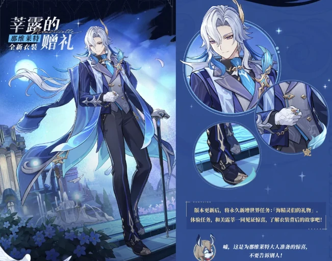 2、月之四版本更新完成后,那维莱特的莘露的赠礼衣装将永久上架角色装扮商城,方便后续有需求的玩家购买。