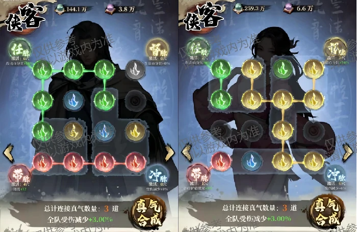 经脉带来的属性加成幅度,取决于真气的合理布局搭配与点亮穴位的数量,少侠可以多尝试不同排布方案,逐步掌握布局诀窍,从而获得最大化的战力提升