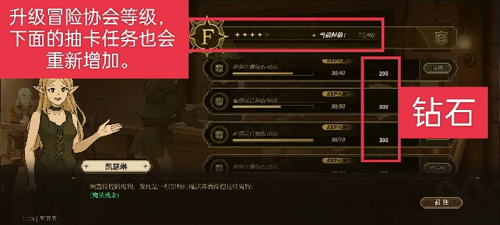 提升冒险协会等级后,对应的英雄抽卡任务会刷新重置,完成这些任务就能获取钻石奖励