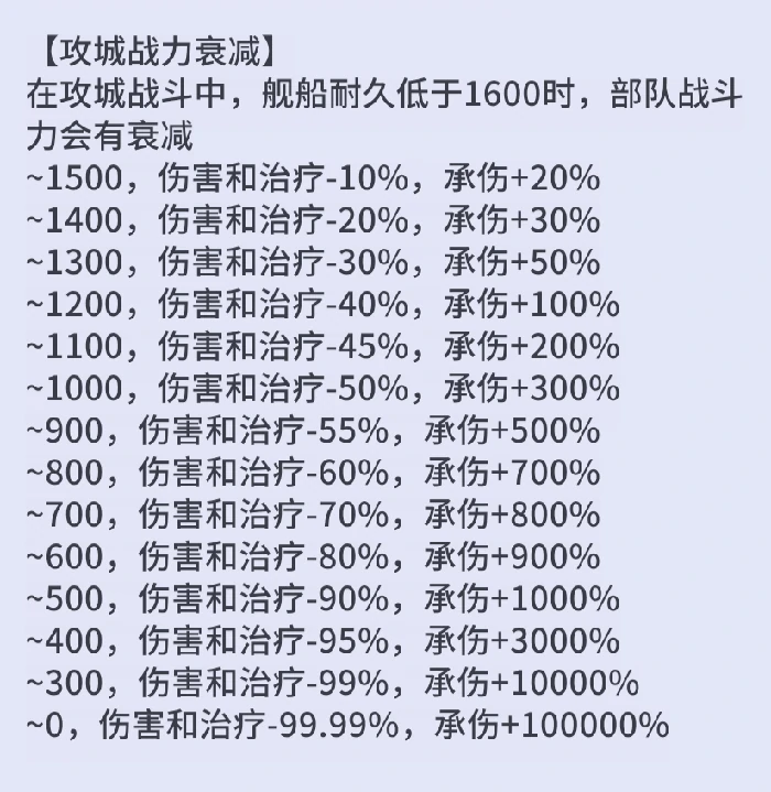 ① 无皮肤的基础舰队初始耐久为2000点,在城战、货轮玩法中发生战斗会产生固定耐久损耗:与城市守军对战单次消耗100点,与其他玩家舰队对战单次消耗200点。当舰队耐久低于1500点时,会触发负面Debuff,战败概率显著提升。