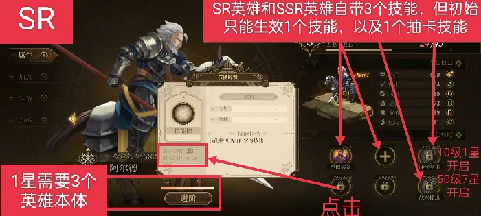 1.英雄抽卡(英雄分为3种品质:R普通、SR金色、SSR红色)