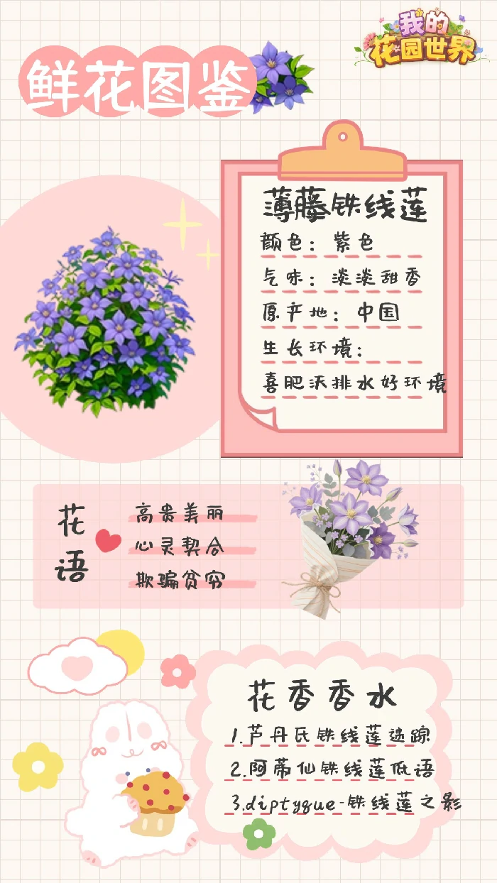 我的花园世界 薄藤铁线莲图鉴:这款铁线莲有着柔美的淡紫色花容,自带清浅甜香气息,原生地为中国。它偏好肥沃且排水顺畅的生长环境,花语涵盖高贵美丽、心灵契合,同时还有欺骗贫穷的寓意。其独特花香也成为不少小众香水的创作灵感来源。