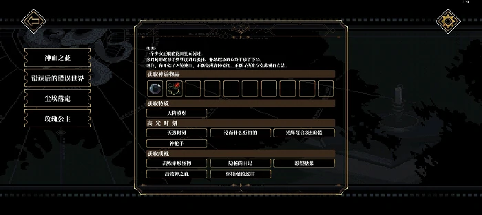 第四次终于成功达成好结局,具体流程如下:开局先找两名守卫下手,从其中一个身上偷取线索,另一个身上的福佑药可偷可不偷,但线索是必备项。之后找到沃克,顺手拿上弓箭(这里推荐搭配警长+学者的组合,让警长担任队长),前往右下角找到赌徒,花钱贿赂他,拒绝和他赌局,对方就会离开,同时留下一条线索。接着在右下区域顺手拿取一把钥匙。左下角有一名濒死者,要是之前偷到了福佑药,直接喂给他即可;没药的话等他去世后直接搜尸就行。来到地图最上方的讲台区域,有了从赌徒那拿到的线索就能发现暗道。进入暗道后,熄灭雕像两侧的火把,就会出现三眼怪,击败它就能拿到神话物品八方体。对着中间的雕像一直选择拒绝,还能获得一项特质;中间的石头拿不拿都不影响后续流程。