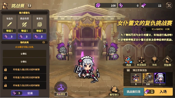无名骑士团全新限时活动女仆蕾文的复仇挑战赛将于1月13日正式开启,参与挑战就有机会赢取蕾文的限定女仆皮肤。大家可以通过每日免费获取的入场券挑战指定骑士,积累抽奖代币与强化积分,兑换丰厚奖励的同时还能不断刷新伤害纪录,记得及时参与奖励兑换哦。