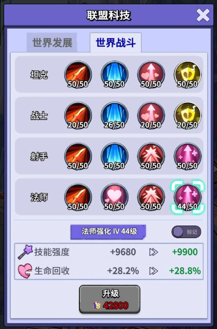 完成以上操作后,就可以开始点世界战斗板块了,建议先将四个职业的前三个强化都升到10级,解锁全部科技后,再结合自己的阵容针对性加点就行。种子汽油拉满和资源地等级提升没有绝对的最优顺序,上面的步骤也不需要严格执行