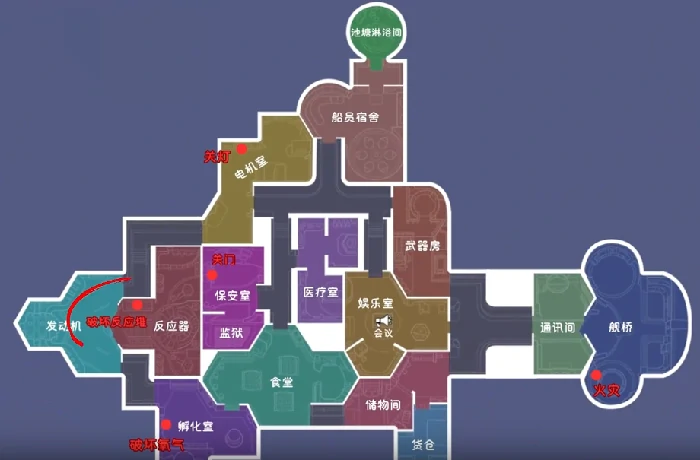 破坏氧气供应的事件机制和其他破坏事件类似,只要鹅阵营没在限定时间内完成修复,鸭子阵营就获胜。需要重点注意的是,整张地图的通风口是全连通的布局,工程师、鸽子还有大部分鸭子阵营的角色都可以通过通风口自由穿行。而监控室能够实时调取各个区域的画面,是玩家收集信息、制定战术的关键核心点位。