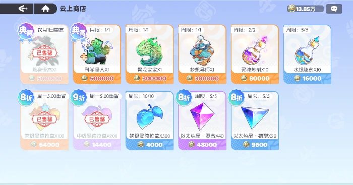 ※这里划重点:中级、高级曼德拉草是长期刚需材料,除了魔物炼制和合成,云上商店每周也能购买,一定要优先入手高级曼德拉草。