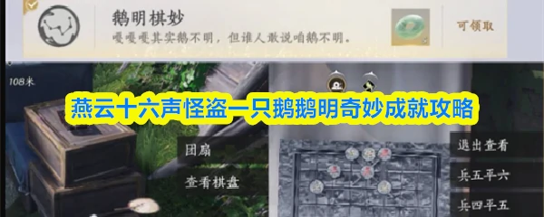 在燕云十六声周年庆趣味活动怪盗一只鹅中,玩家将以大鹅的身份在清河镇完成一系列任务,活动共暗藏9个隐藏成就,其中鹅明奇妙成就的获取方法为:前往地图指定位置找到棋盘,依次选择兵四平五、兵五平六、兵七进一三步棋即可完成。