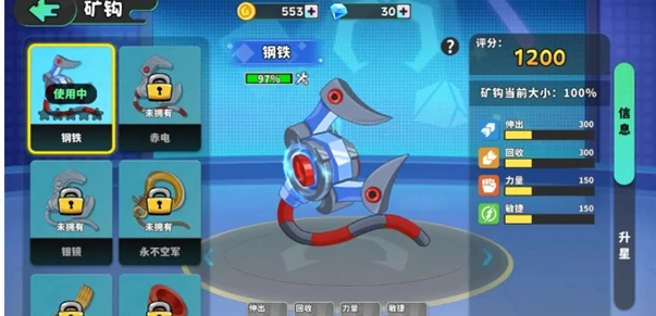 在经典矿工玩法中,矿钩品质从低到高分为蓝、紫、橙、红四个等级。品质越高,基础属性越扎实,抓矿时的稳定性也越强。蓝色是新手玩家的初始入门装备,紫色主打高性价比,橙色在精准度与功能上更具优势,红色作为终极神器可搭载专属主动技能,是所有矿工玩家的最终追求。
