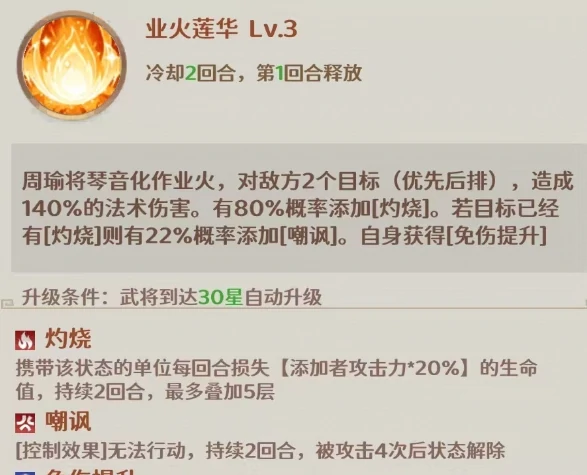 灼烧是游戏里实用性拉满的异常状态之一,敌人被挂上灼烧后,每回合会按照施法者攻击力的20%持续掉血,这个debuff最多可以叠加5层,叠满之后单是灼烧的持续伤害就相当可观。而嘲讽效果能让被控制的敌人无法主动行动,只有在承受4次攻击后,嘲讽状态才会解除。周瑜触发的免伤提升效果,能带来10%的伤害减免,最多可叠加3层。他的大招是全体攻击型技能,在对敌方全体造成法术伤害后,目标身上每有一层灼烧,就能让周瑜本次攻击的暴击率提升10%,最高能提升30%;如果目标同时被挂上了嘲讽,那这次大招的暴击伤害还会额外提升40%。除此之外,周瑜还有两个被动技能:进入战斗后直接提升自身输出能力,回合结束时会对随机一名敌人造成真实伤害;战斗刚开始时,他还有90%的概率直接给随机一名敌人挂上灼烧debuff。