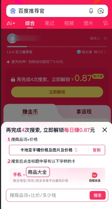 想要进入百度推荐官,有两种便捷方式,一是点击下方指定链接直接跳转,二是打开百度app搜索百度推荐官。成功登录账号后,你可以通过完成平台任务、邀请好友的方式获取金币,攒到一定数量就能兑换佣金,还能申请提现,同时还有购物返现的福利可以享受。