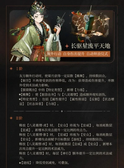 - 当傩舞层数达到阈值时,主动释放的1技能将被判定为额外行动;
