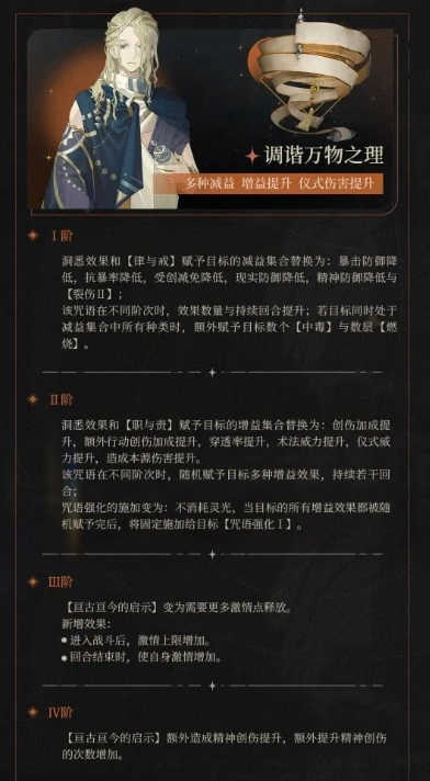 增益集合则移除了双防提升、痊愈1、反震1,新增创伤加成、额外行动创伤加成、仪式威力提升、本源创伤提升。高阶2技能赋予的buff数量和持续回合也同步提升。