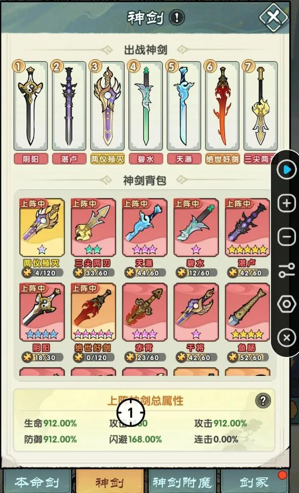 这套PK阵容在对阵没有阴阳剑的对手时,实现越1-2亿战力取胜完全没问题,各神剑分工明确:1阴阳剑:全程主打输出,只要对手没有控制手段就能全力爆发;2湛卢剑:开启护盾来降低我方承受的伤害;3两仪剑:负责补充伤害输出;4碧水剑:既能提升技能伤害,还能重置任意一个技能的冷却时间;5天瀑剑:可以冰冻对手限制其行动;6绝世好剑:能够眩晕对手打断其战斗节奏;7三尖两刃刀:不仅能眩晕对手,还能给敌方施加易伤效果。这套阵容的核心是阴阳剑,它只能通过开箱子获取,无法抽取得到,用这套阵容对阵不带阴阳剑的对手,打起来会毫无压力