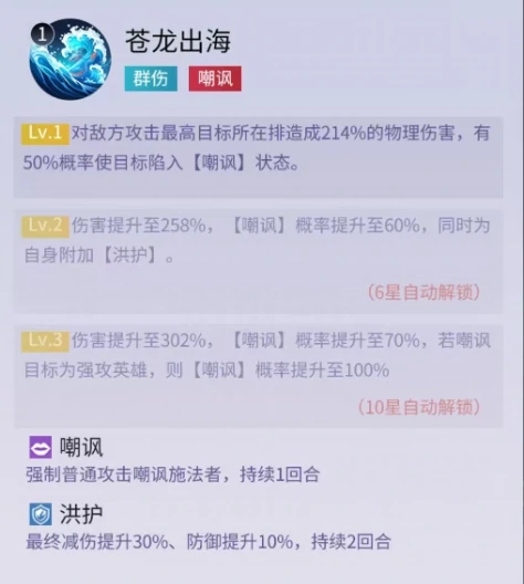 共工的怒气技能会精准锁定敌方攻击最高目标所在的整排,对该排造成物理伤害的同时,有几率让目标进入嘲讽状态,强制对方攻击自己,同时自身获得洪护buff。凭借洪护带来的减伤与防御提升,共工就算吸引了大量火力,生存能力也有充足保障。