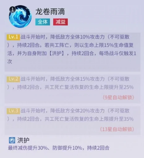 在这款游戏里,共工是兼具嘲讽控场与复活续航能力的顶尖坦克。他的怒气技会精准锁定敌方攻击最高单位所在的整排,有概率嘲讽目标,同时为自身附上洪护效果——该效果可提升最终减伤比例与防御属性。战斗开场时,他还能给敌方全体施加不可驱散的攻击力降低效果,哪怕阵亡后也能触发一次复活,搭配将臣这类治疗辅助,能稳固前排防线,全力保护后排输出。