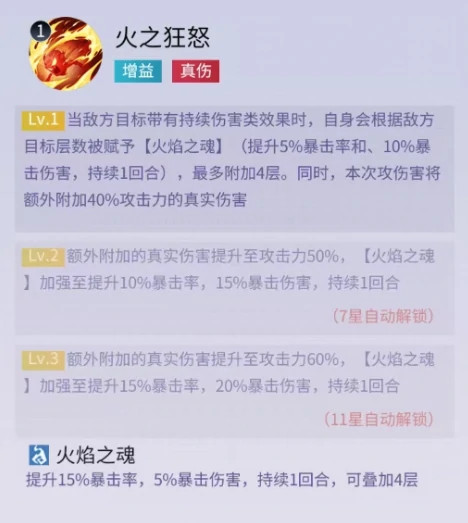 他的另一项技能效果为:若敌方目标身上带有持续伤害类debuff,就能根据目标身上的debuff层数为自身附加火焰之魂,每层火焰之魂可提升5%暴击率与15%暴击伤害,最多可叠加4层,同时本次攻击还会附带额外真实伤害。值得注意的是,除了红孩儿自身施加的灼烧效果外,队友施加的灼烧或其他类型的持续伤害debuff,同样能触发该效果,这让红孩儿能常驻暴击率与暴击伤害加成,输出能力因此变得极为强劲。