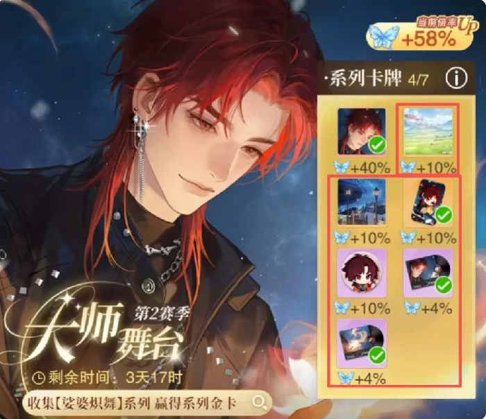 多收集当期赛季的系列卡牌,还能获得积分倍率加成,能有效提升赛季排名哦~获得男主的SSR或UR卡牌后,主理人可解锁对应男主的专属剧情篇章,提升好感度。还能设置男主的陪伴效果,每日额外获得钻石与体力奖励,福利多多喔~