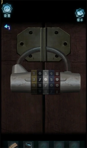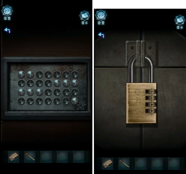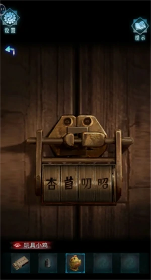1、先观察院子墙面上的打油诗,能看到第一排有2个字在方框内,其余三排分别是3个、3个、1个字在方框外。再看柜顶木匣子的金属机关,每一排的按钮数量刚好和对应诗句的字数一致,而且第一排只有两个按钮是未按下的状态,由此能推断出:方框内的字对应的按钮是需要按下的。按照这个线索,把按钮密码调整为如图所示的状态。