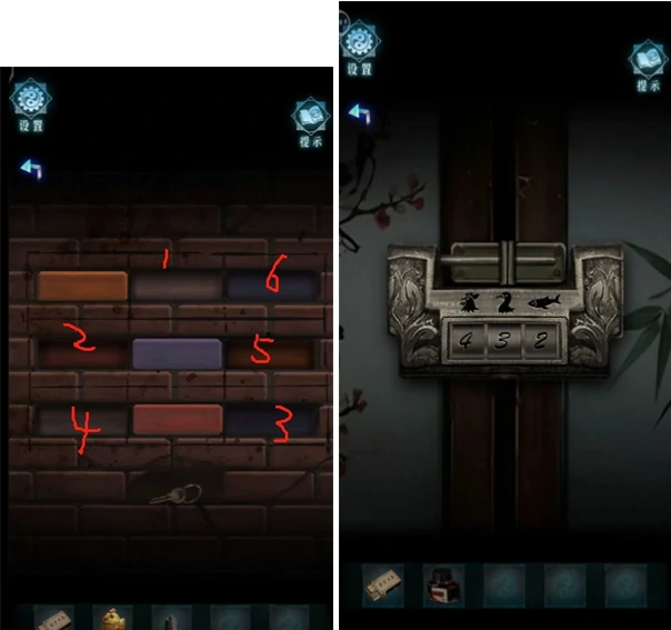 7、查看堂屋架子上册子的最后一页,能得到线索:数字代表需要点击的矩形的顺序,数字的颜色就是对应要点击的矩形的颜色。比如第一格黄色的1,就对应点击第一排的黄色矩形,以此类推。结合厨房窗户上的数字和颜色信息,按照如图所示的顺序点击墙砖即可。