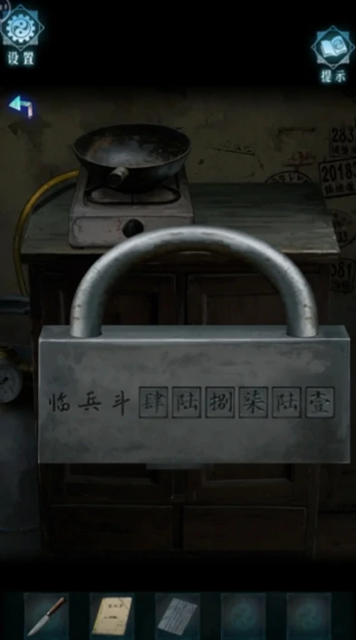 2、找到便条后点击翻转,能获取算数相关线索;前往电闸箱处,可拿到“临、兵、斗”各自对应的数字。结合这两处线索,能总结出“斜对角为相称、横纵为相加”的运算规则,再对照笔记本上的“临兵斗者结阵列前行”内容,按照规则推算出后面5个字对应的数字为468765,输入大写的肆陆捌柒陆伍,就能打开密码锁。