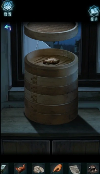 6、打开电视,画面中会依次出现动物:鱼、虾、兔子、牛、鸡,最后出现包子。按照这个出现顺序,在第一层蒸笼放入玉雕鱼,第二层放入虾,第三层放入面兔,第四层放入牛奶,第五层放入纸烧鸡,第六层放入纸包子即可完成该环节。