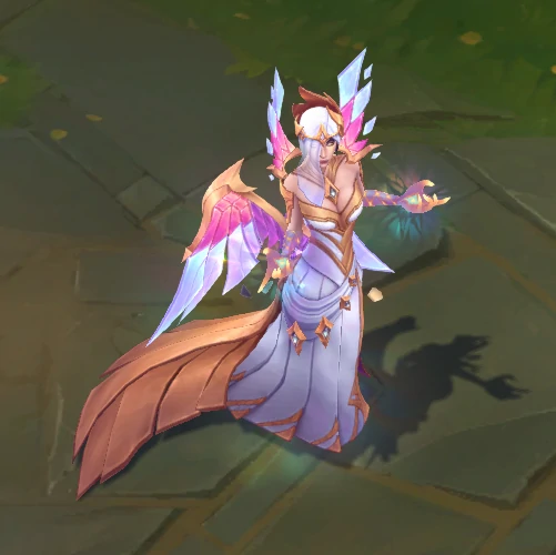 R技能激活后,莫甘娜周身先爆发出亮光,周围与身后逐步展开羽翼形态特效,同时多把长剑会环绕在她周身,后续身后的羽翼会转化为水晶质感,技能的暗黑枷锁顶端采用长剑造型,枷锁连接初期可见锁链结构,后续光效内会显现清晰的玻璃碎片,技能范围圈内侧则是彩绘玻璃图案。