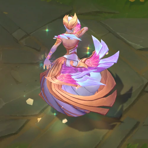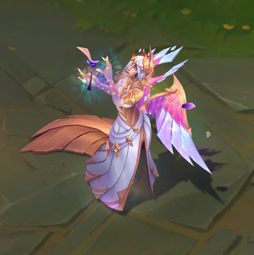 臻彩皮肤蒙面女郎莫甘娜以彩绘玻璃为核心特效灵感来源,模型周身萦绕玻璃质感光效,全技能均呈现水晶与玻璃碎片的独特质感:Q技能化作锁链飞弹形态,W技能触发时地面浮现彩绘玻璃纹样,E技能护盾由细碎玻璃片拼接而成,R技能激活后会展开水晶质感翅膀,同时有剑阵环绕周身,回城动画则会构建出一座精致的彩绘玻璃装饰空间。