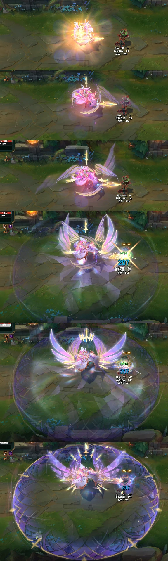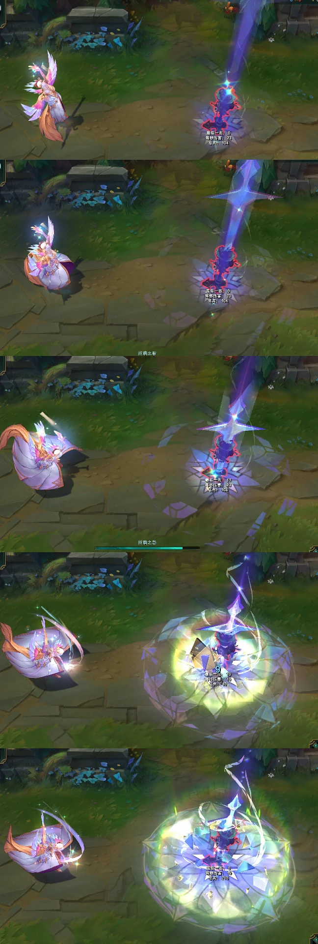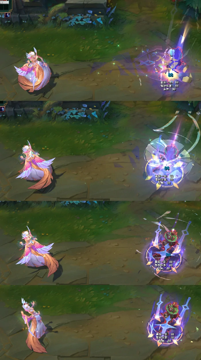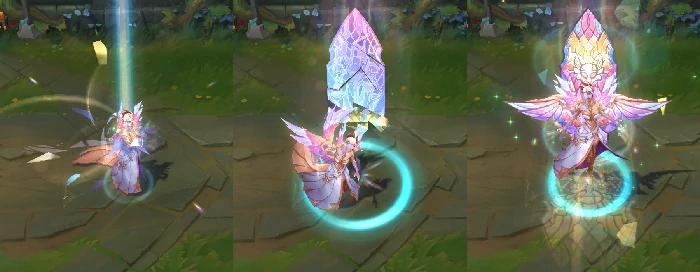 W技能触发时,会有长剑从天而降,地面浮现青绿色亮光与光晕,技能范围内呈现彩绘玻璃图案,表面还会随机出现钻石质感的点缀。