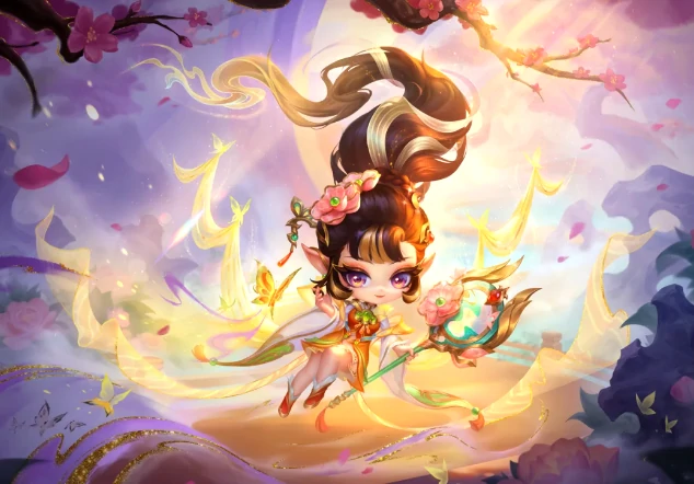 金铲铲之战里的神话级小小英雄薛宝钗小小迦娜,特效设计取材自红楼相关元素,整体风格精致华美。它的攻击特效是掷出团扇化作紫金蝴蝶,命中目标后绽放牡丹花瓣并散出冷香;淘汰特效则是用团扇把对手优雅“夹”入书卷样式的动作中。另外,它还有好几个专属动作,比如召唤蝴蝶、摇开云雨以及对镜贴花黄等。