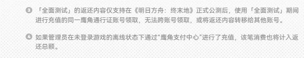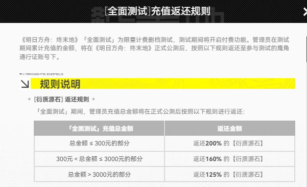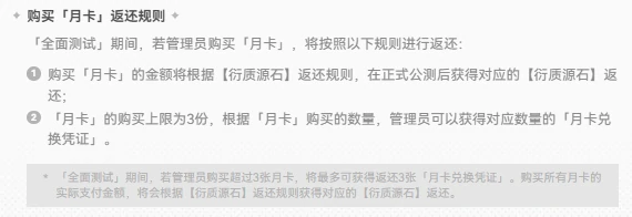 1. 全面测试期间,若玩家购买的月卡数量超过3张,最多可获得3张「月卡兑换凭证」的返还。而购买所有月卡的实际支付金额,将按照衍质源石的返还规则,兑换为对应数量的衍质源石进行返还。