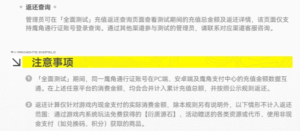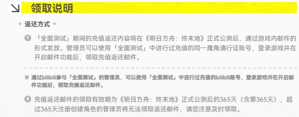 全面测试期间产生的充值返还内容,将在明日方舟终末地正式公测后,以游戏内邮件的形式发放给各位玩家。参与过测试且有充值行为的玩家,需使用当时充值的同一鹰角通行证账号登录游戏,待邮件功能开放后,即可领取对应的充值返还邮件。