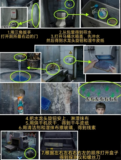 6、观察厕所玻璃上的荧光手印,按照左右左右右右左的顺序,依次点击安检口地面工具箱的左右按钮。