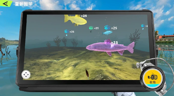 2. 抛竿之后,要利用探测器查看水下鱼群的游动态势,通过操控拟饵来吸引鱼儿咬钩,这一步操作有一定难度,想要钓获大鱼就得拿出足够的耐心慢慢诱鱼