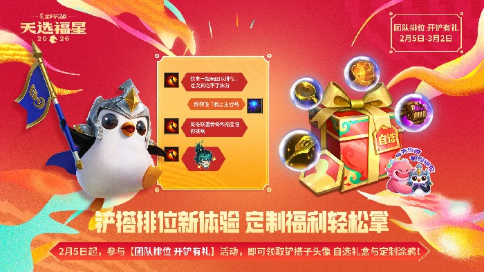 2月5日更新后,金铲铲之战将围绕福星守护者主题上线一系列全新内容与社交玩法。各位玩家可探索全新的守护者档案,比如神射手烬、三国猛将赵信等角色的专属档案,同时两大核心玩法活动同步开启:1. 团队排位:全新上线的模式,参与就能解锁专属头像、定制涂鸦等福利;2. 铲搭请响铃:通过语音匹配专属铲搭子,完成指定任务可领取羽饰骑士皮肤、专属名片等道具,彻底告别单排孤单。