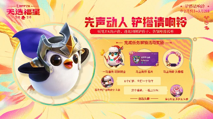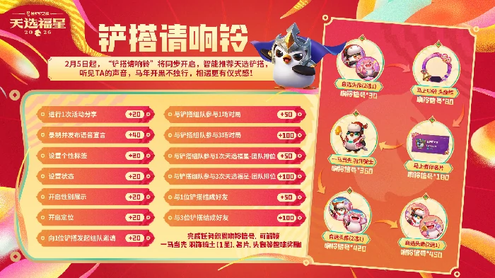 怕春节开铲没人组队?2月5日起,铲搭请响铃活动正式开启,通过语音匹配找到同频铲搭子,彻底告别单排的孤单!