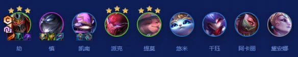 阵容成员包含劫、慎、凯南、派克、提莫、猫咪、千珏、阿卡丽、皎月