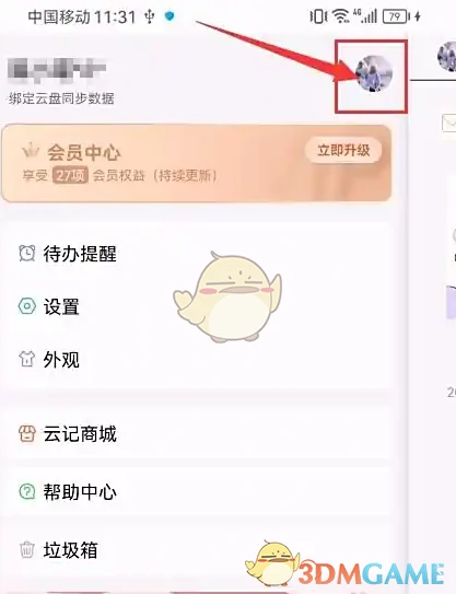1、启动云记应用后,点击界面上的个人头像图标。如图: