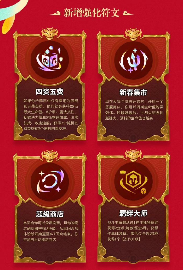 要是你的阵容里只有四费和五费英雄,那么这些英雄将直接获得88点最大生命值、8点护甲与魔抗、8点初始法力值,同时还有8%的物攻、法强和攻速加成。另外还会额外给到你2个随机五费英雄和2个随机四费英雄。