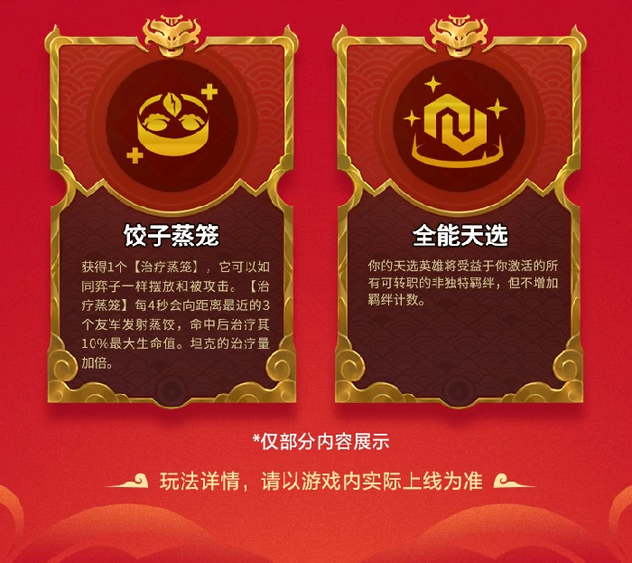 你将获得1个饺子蒸笼,它可以像弈子一样被摆放和攻击。饺子蒸笼每4秒会向距离最近的3名友军发射蒸饺,命中后能为友军治疗10%的最大生命值,要是友军是坦克英雄,治疗量还会翻倍。