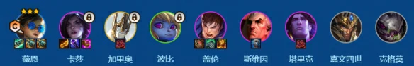 2、3-5阶段优先追薇恩和其他德玛西亚棋子的二星,等解锁加里奥之后,4阶段上8级开始d牌,全员二星之后,就根据来牌情况决定是继续追三星薇恩,还是上9级补充费德提克、奥恩这类通用五费卡。中期全员二星且开出加里奥后,再逐步替换成阵容体系内的棋子,过程中需要注意留牌和换牌d牌的操作细节。
